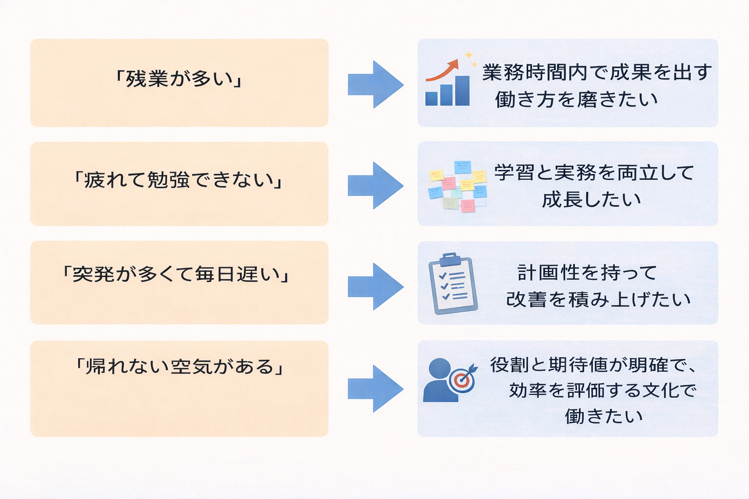 「帰れない空気がある」→「役割と期待値が明確で、効率を評価する文化で働きたい」