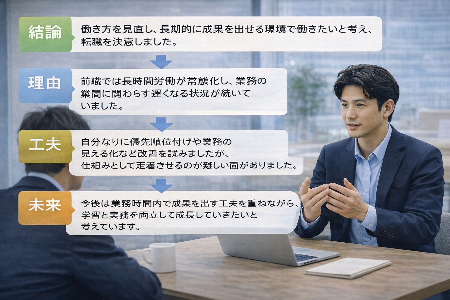この中身を一つに絞るだけで、転職理由は一気に話しやすくなります。なぜなら、「残業が多い」が“働き方の構造”の話になるからです。