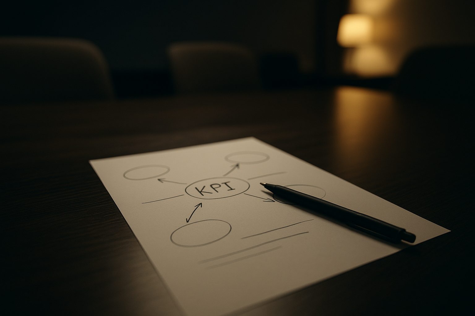 A4用紙のKPI設計図・スマホのメモ・チェックリストを並べたデスク俯瞰(6:4 横長)
