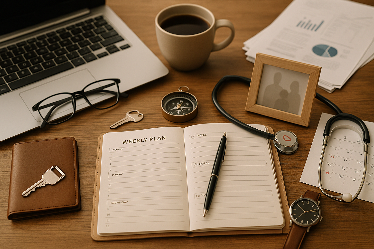 ウィークリープランナーと付箋・チェックマーク・カレンダーの俯瞰写真(21日プランのイメージ、文字なし)