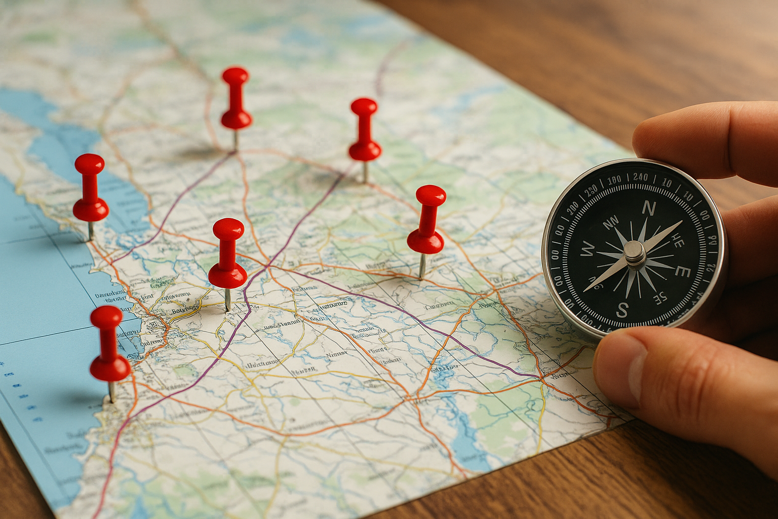 alt=”地図に複数のピンとコンパスを置いた写真”