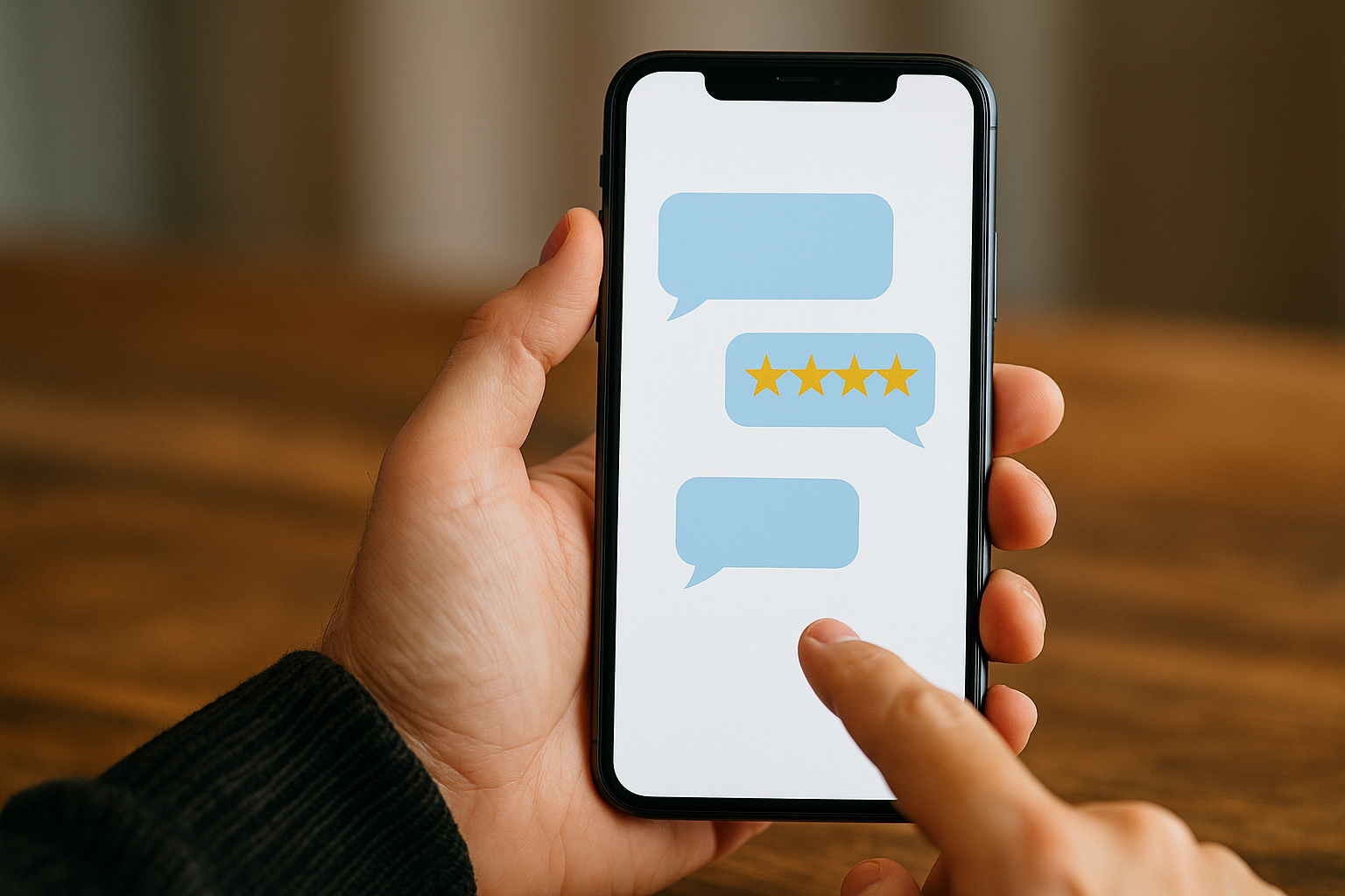 alt=”スマートフォンに口コミバブルと星評価が映る写真”